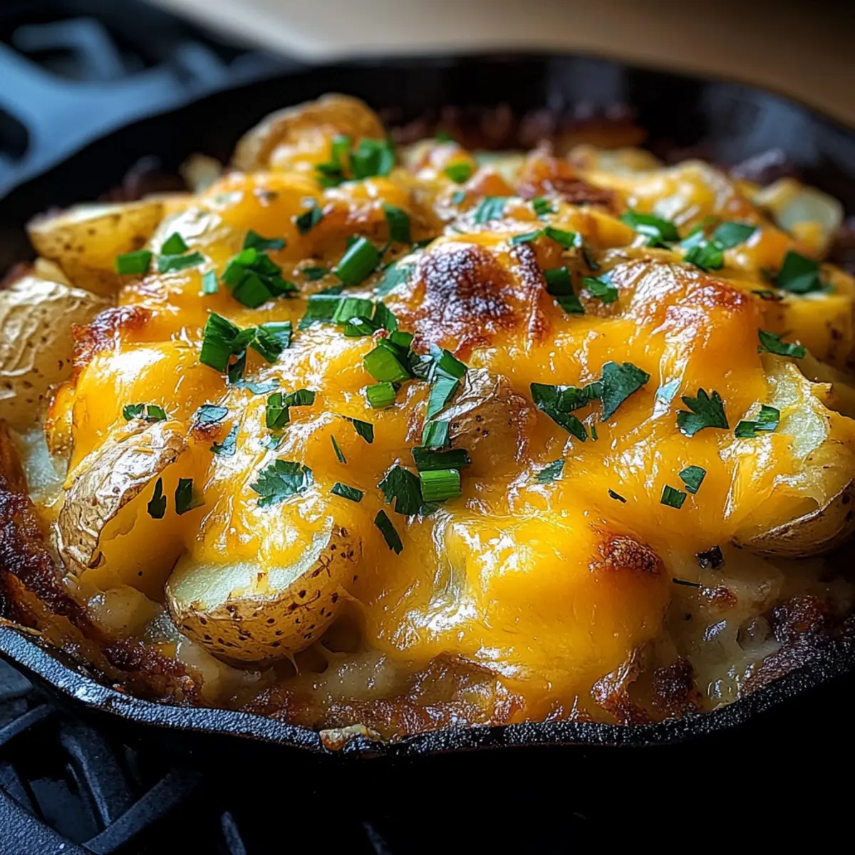 Add the cheese: Once the potatoes are done, sprinkle the shredded cheddar cheese evenly on top. Cook for an additional 2-3 minutes until the cheese is melted and bubbly.
