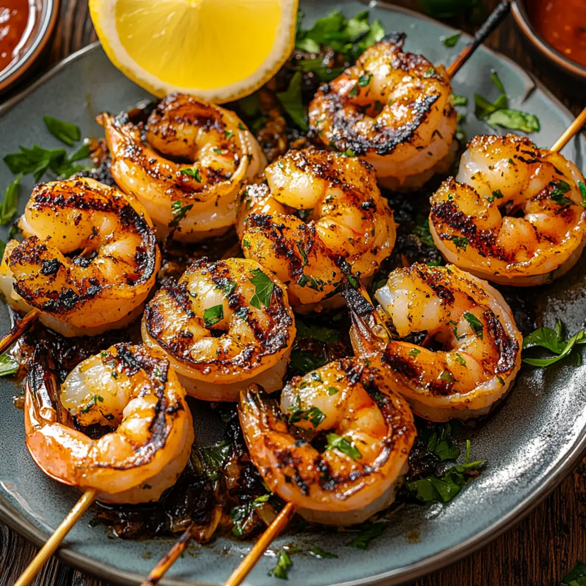Serve and Enjoy: Plate the grilled shrimp skewers with fresh herbs and lemon wedges for an impressive presentation and burst of color.